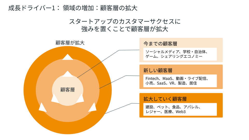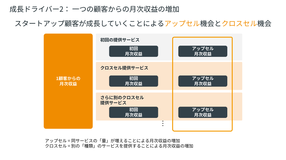 スタートアップは成長を目指しているため、成長に合わせてアップセルの機会だけでなく、成長により新たに生じる課題を解決するためにクロスセル提供の機会も増加します。スタートアップの課題に対応していくことでアップセルとクロスセルが増えていきます。