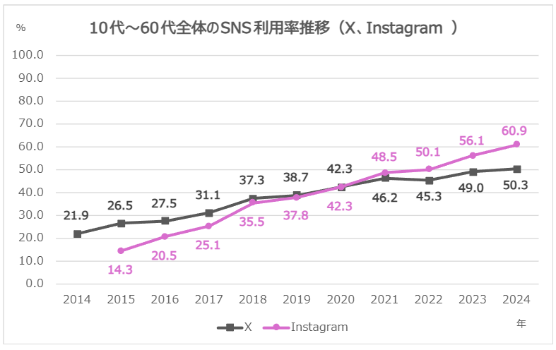 総務省のデータによると、10代~60代全体におけるXとInstagramの利用率は拡大傾向にあります。Instagramは2015年の調査以来、年々上昇傾向にあり、2015年の14.3%から2024年には60.9%と46.6ptの増加、Xは2022年にやや減少したものの、2014年と2024年を比較すると、28.4pt増加しています。